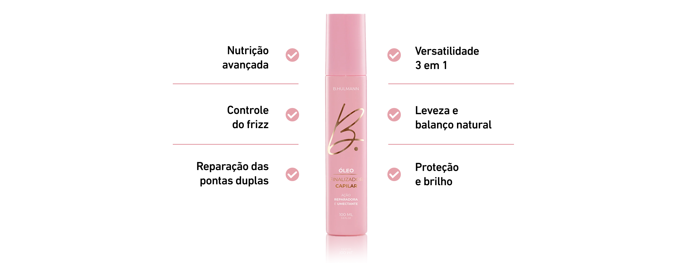 O óleo reparador nutre profundamente os cabelos e combate problemas como frizz e pontas duplas, ao mesmo tempo em que alinha as cutículas, evitando que os fios fiquem pesados. Além disso, proporciona elasticidade e um toque sedoso aos cabelos, deixando-os leves e com um balanço natural.